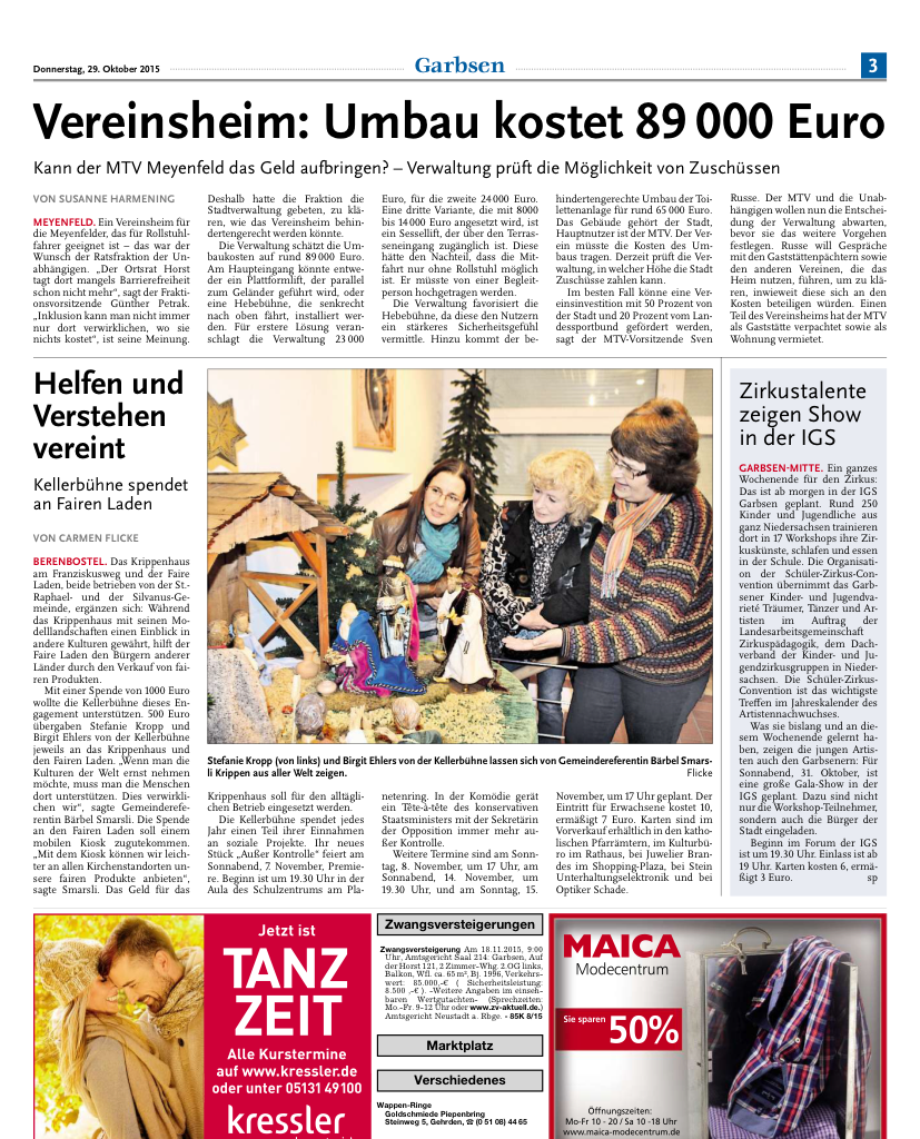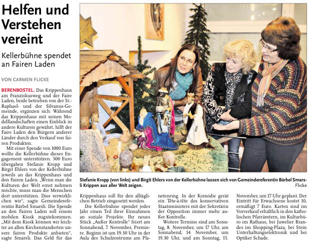 "Mit Theaterkunst läßt sich eine Wohnung nicht einrichten. Aber wer so gut spielt wie die Kellerbühne Garbsen, der hat nach vier Vorstellungen vielleicht noch etwas übrig. 500 Euro sind es in diesem Fall. Das Geld haben Silke Fütterer und Stefanie Kropp vom Ensemble der Laiendarsteller dem sozialen Kaufhaus am Bärenhof übergeben. "Wir wollen nicht nur unterhalten, wir wollen uns auch sozial engagieren", sagt Fütterer. Rainer Kaste, Geschäftsführer der Labora-Einrichtung, dankte und stellte der Kellerbühne in Aussicht, für das nächste Stück mit Requisiten auszuhelfen. Iz"